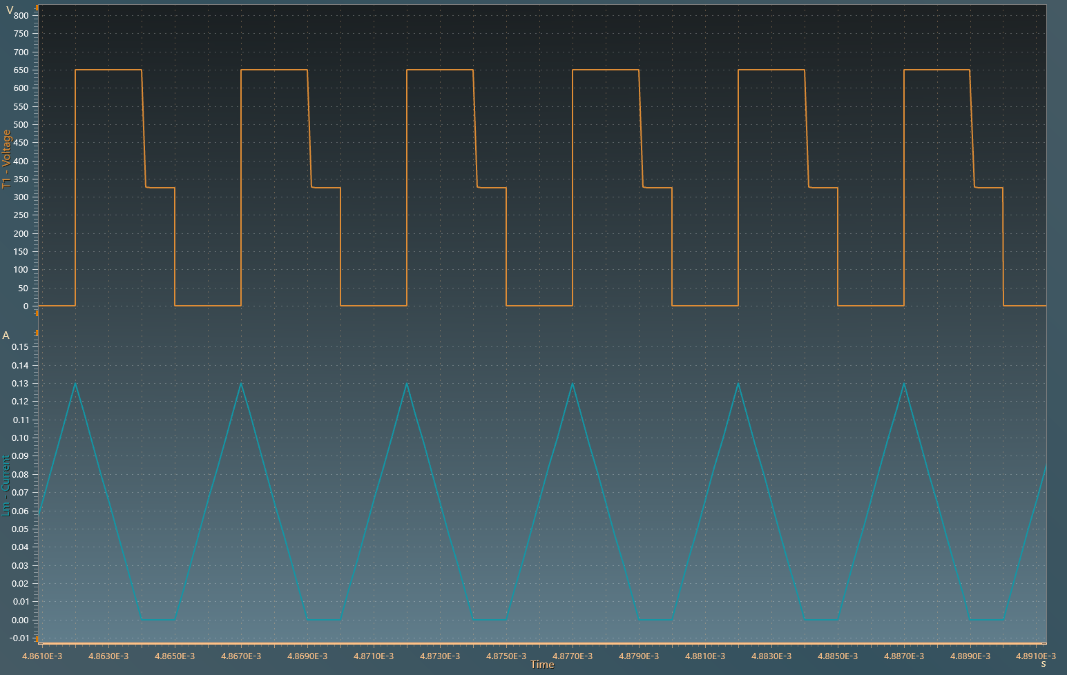 The results below present the transistor T1 voltage and current flowing through magnetizing inductance Lm: