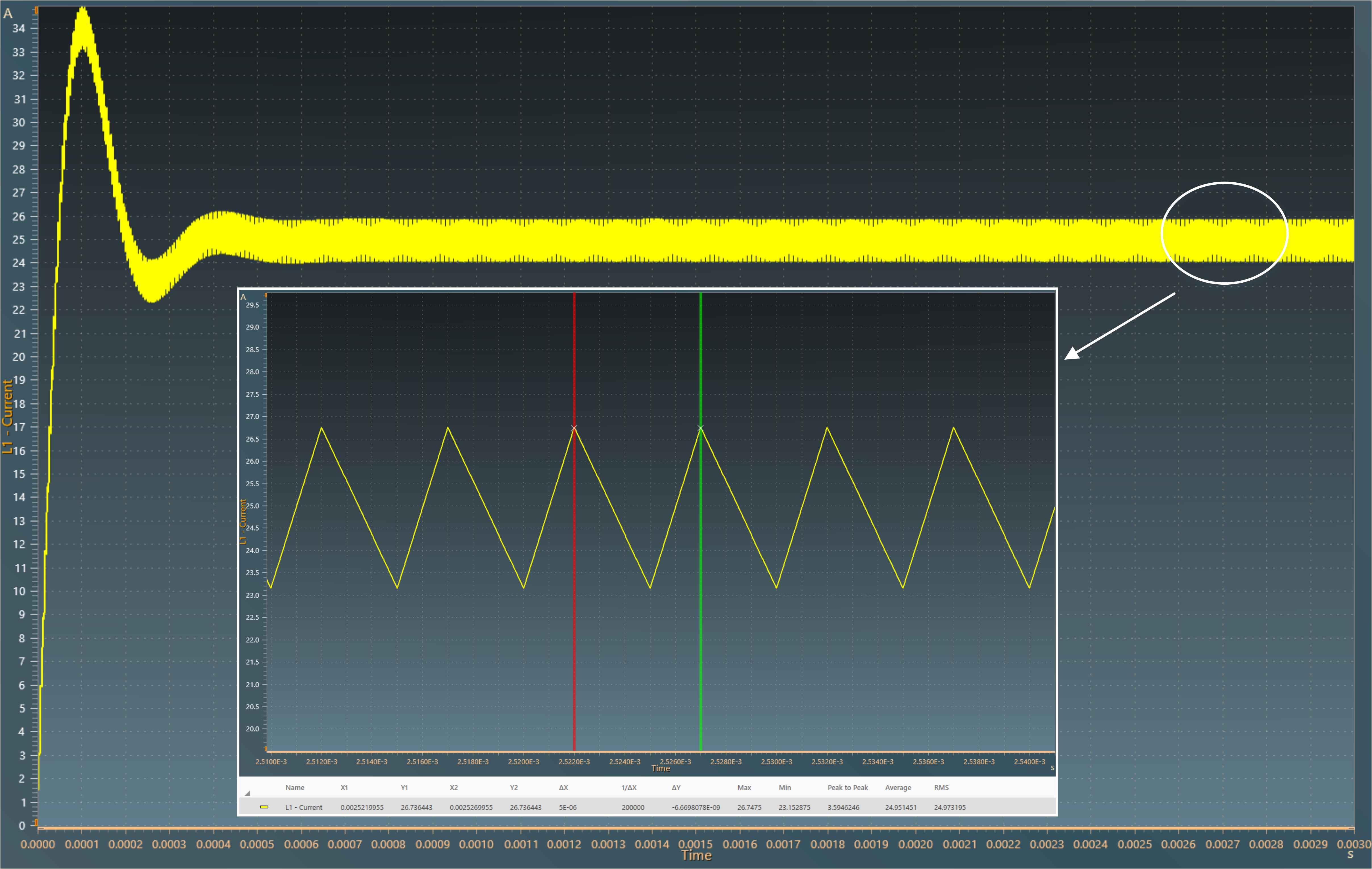 The results below show the current flowing through the inductor L1. A zoom shows a measure of the average value of this current : 25 A.