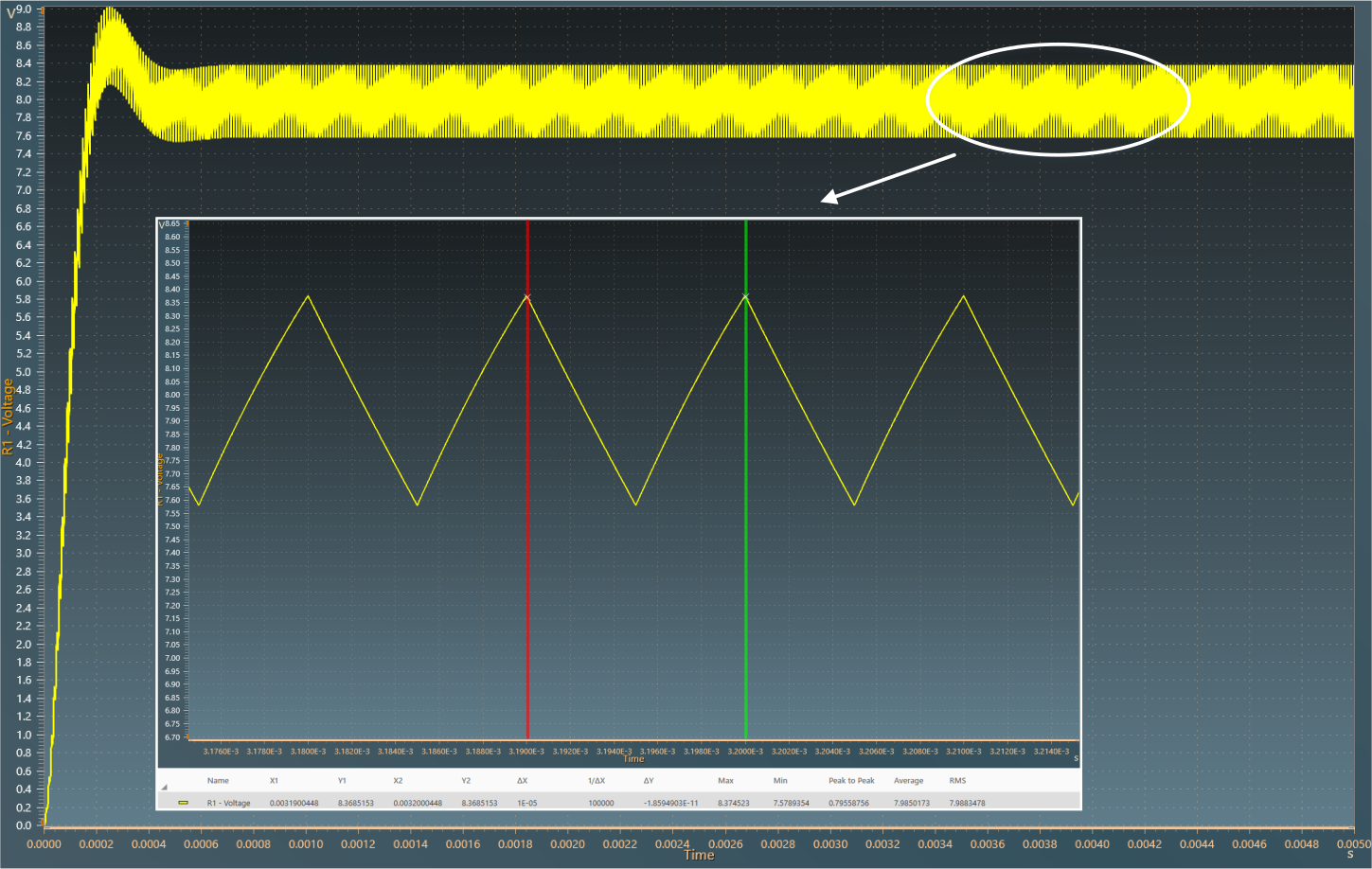 The results below show the output voltage across R1 with a duty cycle D = 0.5. A zoom shows a measure of the average value of this voltage : 8V.