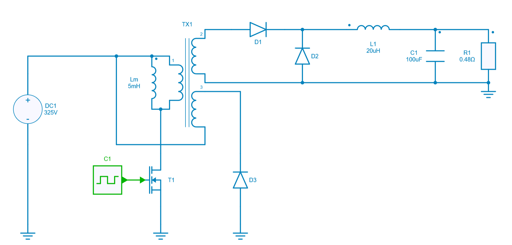 A Forward Converter is a DC-DC converter that uses a transformer to provide electrical isolation and can supply an output voltage that is either higher or lower than the input voltage. The output voltage is determined by the input voltage, the transformer turns ratio, and the duty cycle. Said converter is more complex than a flyback converter, but it can provide higher output power and energy efficiency. The secondary side of the forward converter functions similarly to a buck converter in terms of energy storage and delivery.