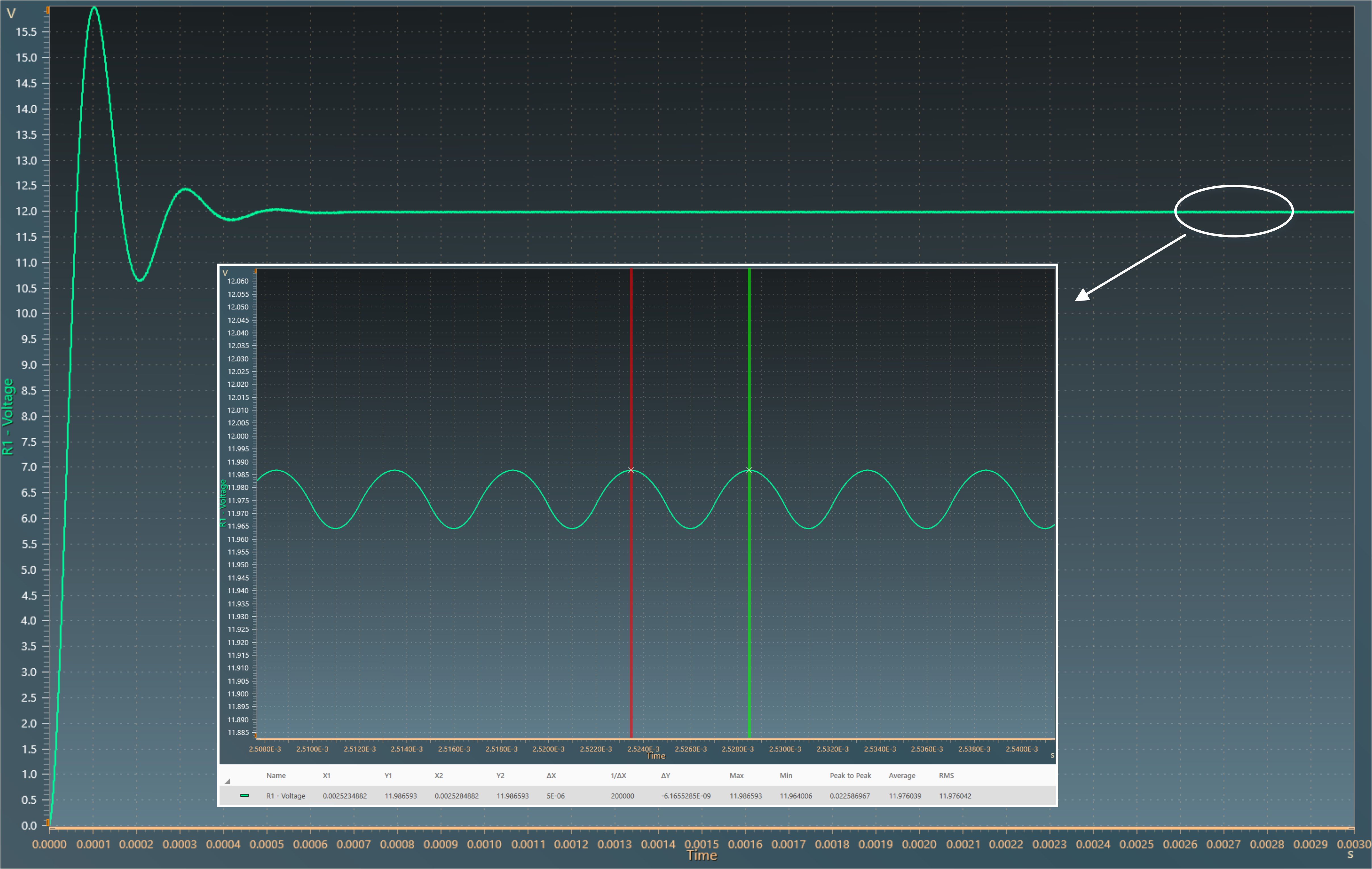 The results below show the output voltage across load resistor R1. A zoom shows a measure of the average value of this voltage: 12 V.